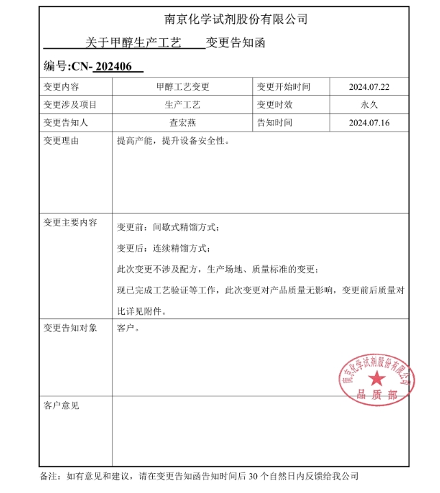 關(guān)于甲醇生產(chǎn)工藝變更告知函詳情如下:
