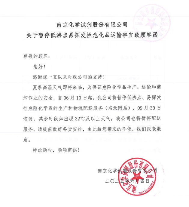 夏季高溫天氣即將來(lái)臨,為保證危險(xiǎn)化學(xué)品生產(chǎn)、運(yùn)輸和裝卸作業(yè)的安全,自 06 月 10 日起,南試公司將暫停低沸點(diǎn)、易揮發(fā)性危險(xiǎn)化學(xué)品的生產(chǎn)和物流配送服務(wù)(名錄附后),預(yù)計(jì) 09 月30日恢復(fù),其余時(shí)段如出現(xiàn) 32℃及以上天氣,我公司也將暫停配送服務(wù)。請(qǐng)請(qǐng)?zhí)崆白龊脗湄洶才?,由此給您帶來(lái)的不便,我們深表歉意。詳情如下: