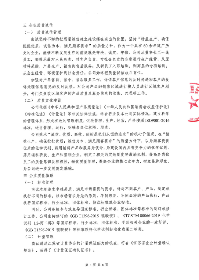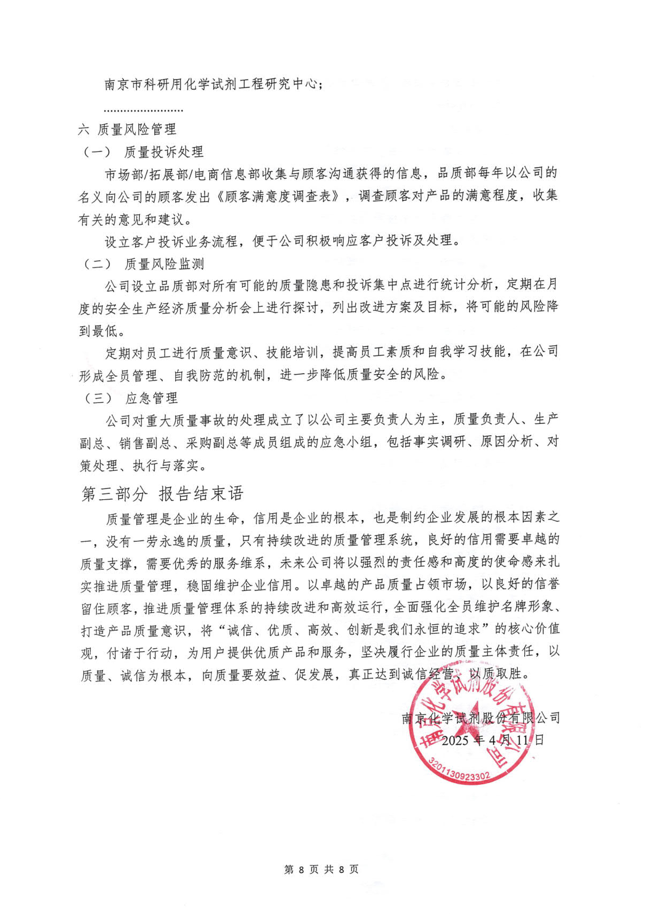 《南京化學(xué)試劑股份有限公司質(zhì)量信用報告》回顧了南京化學(xué)試劑在質(zhì)量管理、產(chǎn)品質(zhì)量責(zé)任、質(zhì)量誠信管理等方面的方針、制度、措施及取得的成效。關(guān)于報告的內(nèi)容,說明如下:
