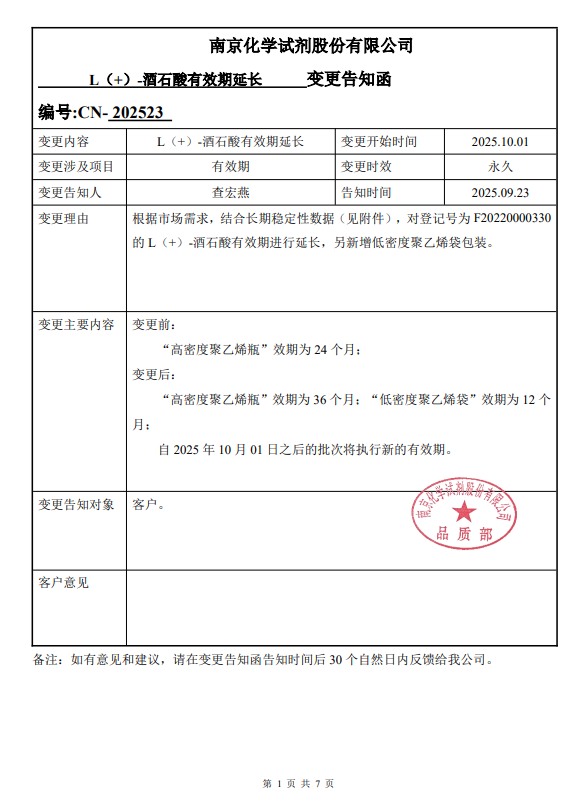 根據(jù)市場需求,對登記號為F20220000330的 L(+)-酒石酸有效期進(jìn)行延長,另新增低密度聚乙烯袋包裝。