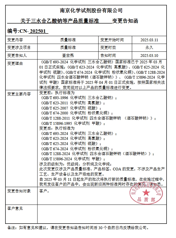 化學(xué)試劑三水合乙酸鈉、高氯酸、硫酸粉狀氧化銅、四水合酒石酸鉀鈉甲酸等六個(gè)產(chǎn)品質(zhì)量標(biāo)準(zhǔn)更新,此次變更涉及的級(jí)別有優(yōu)級(jí)純純、分析純和化學(xué)純,實(shí)施過(guò)程中會(huì)出現(xiàn)兩種標(biāo)準(zhǔn)號(hào)的產(chǎn)品!變更日期2025年03月11日,詳情如下: